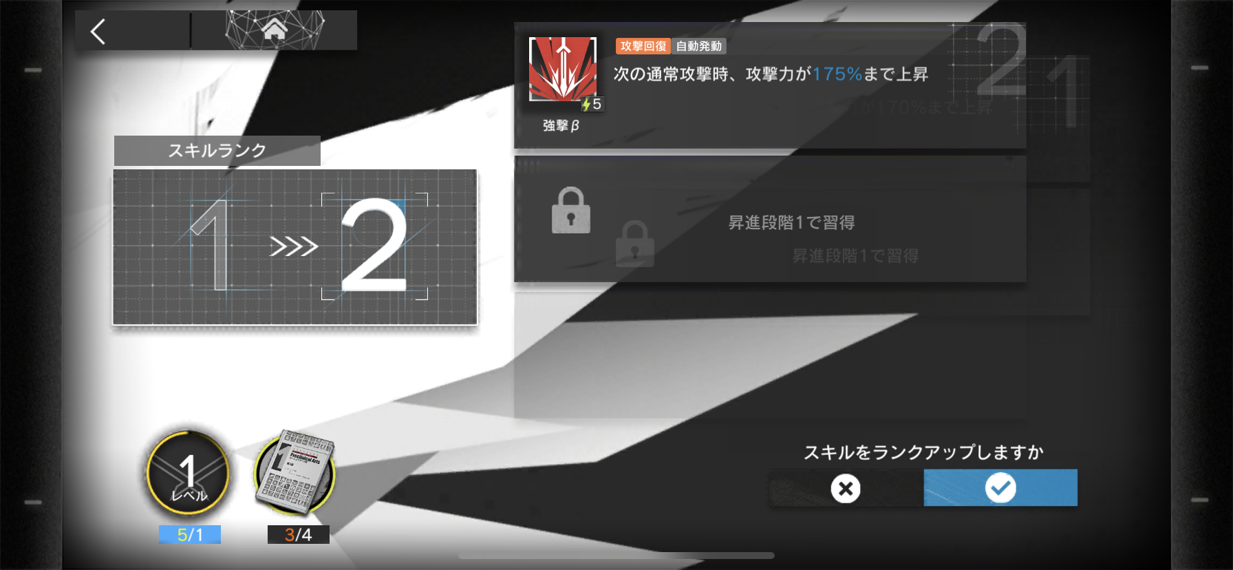 スキルはアイテムを使うことでレベルを上げて強化することもできます。さらに、「昇進」をさせることでステータスの上限が上がるだけでなくスキルを追加で習得できちゃいます。