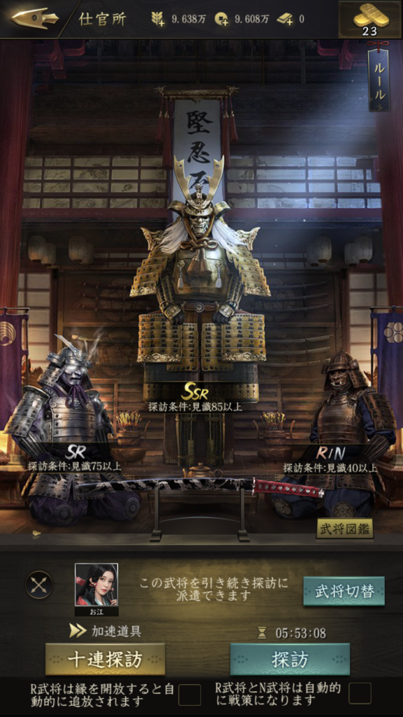 コツコツ武将の見識を上げてから「探訪」をしなければ、レアな武将はなかなか入手できないので、リセマラは必要ありません