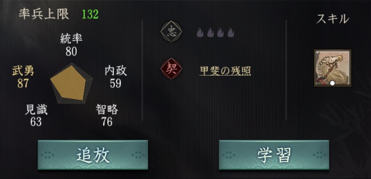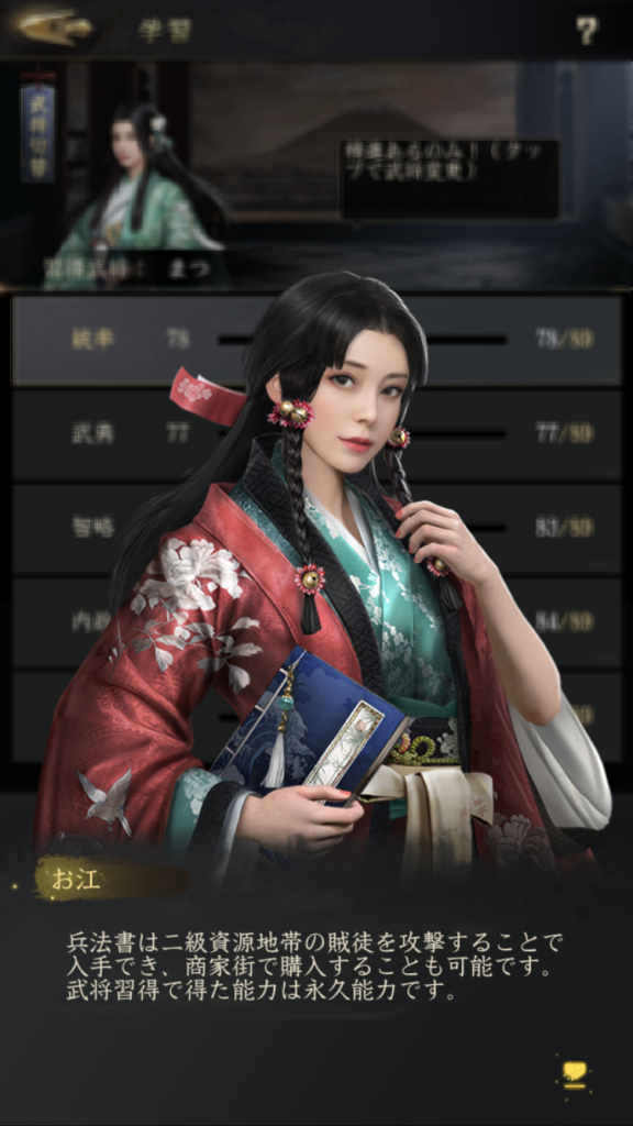 | ③ | 探訪を行う武将の見識を85以上まであげる(序盤からいる武将のお江は見識81のため、見識を上げることをおすすめ) |