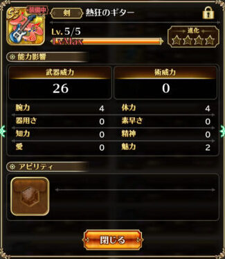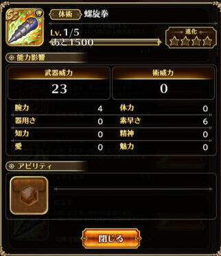 ステータス補正は素早さのみとなっているので素早さが元々早いキャラや行動順の調整をしたいキャラなどに装備させるのがおすすめです。
