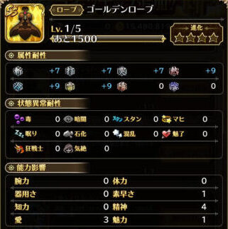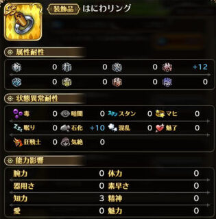 他にも暗闇耐性も盛れて術などに多い属性耐性も強化することができます。