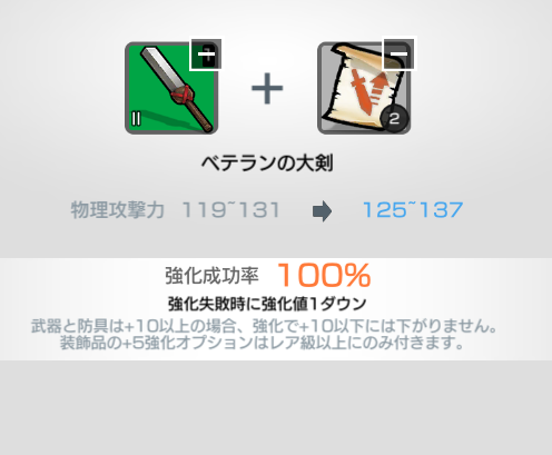 ただし、+10以上の装備強化に失敗しても10以下になることはなく、下がるのは11以降になってからです。