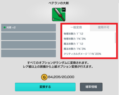 変換されるオプションの内容は変換可能なオプション目録で確認することができ、その中からランダムで変換されます。