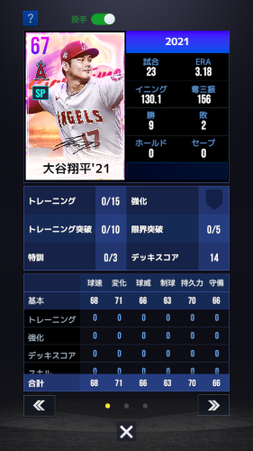 ちなみに、こちらの画像ではシグネチャーの大谷選手ですが、LIVEバージョンの大谷選手の方が初期能力値のほうが高く、総合的な評価は全レアリティの大谷選手の中でも一番だと思います。
