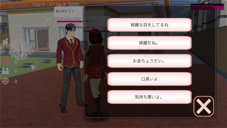 会話には選択肢が用意されており、褒める言葉・お金をねだる言葉・悪口の三種類があります。