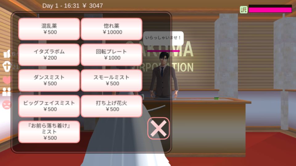 惚れ薬は、街の中に落ちているものを拾うか、サクマ商事に売っているものを10000円で購入することで入手出来ます。