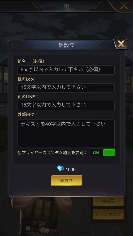 欲望都市の組は、ダイヤ1000個消費して組を設立することができます。