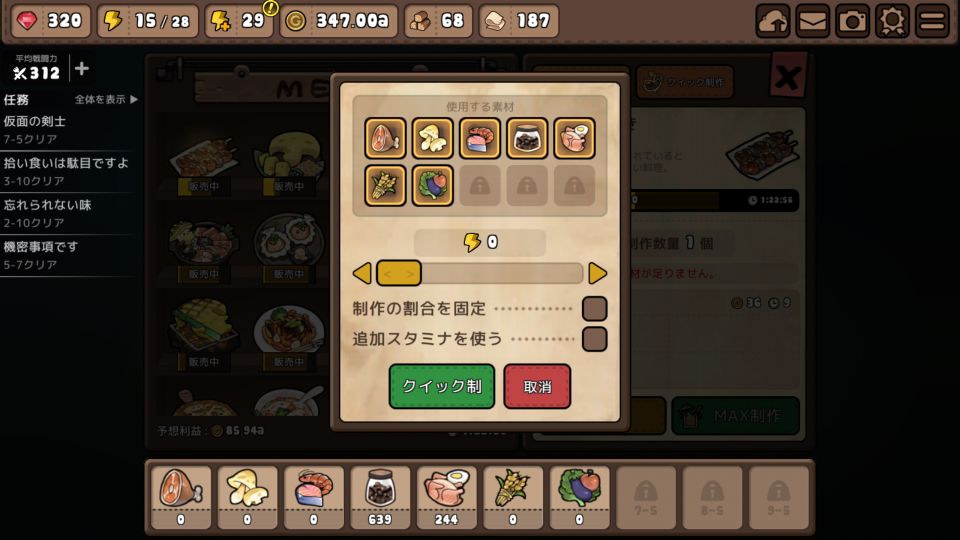 ゲームが進むと、材料を選んで一度に数種類の料理を作成する「クイック料理」機能が開放されます。